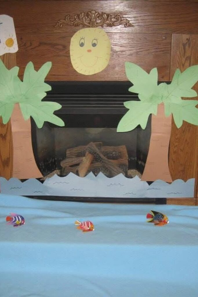 Paper decorations create a beach-like corner indoors. Soft lighting adds warmth.