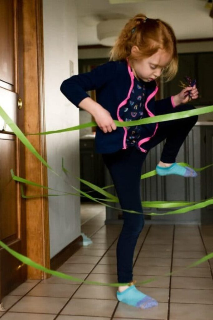 Tape mazes turn hallways into obstacle courses. Kids crawl and stretch carefully.