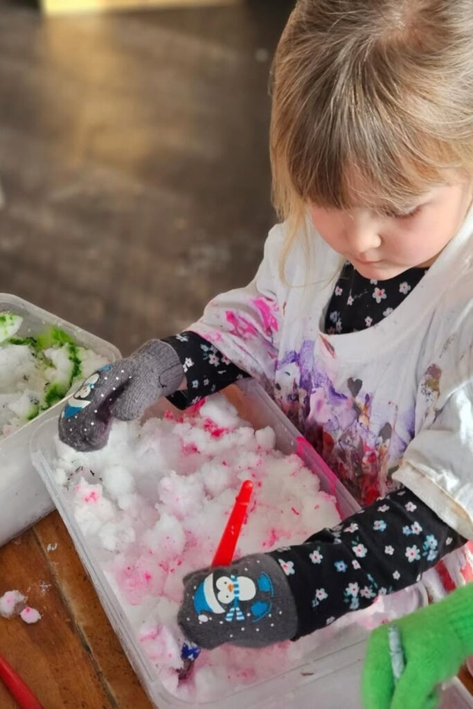 Snow bins bring winter fun indoors. Kids scoop and color snow.