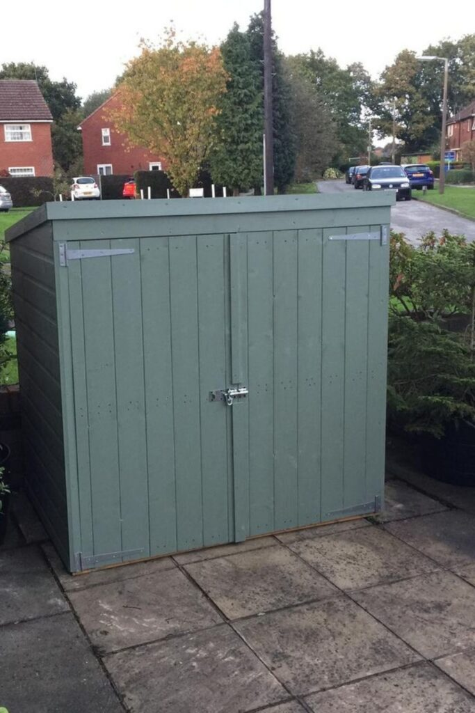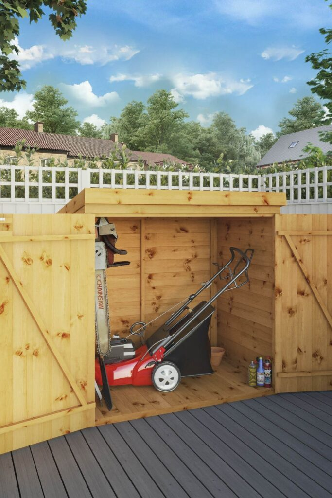 Use a thin side yard by building a tall, skinny shed from plywood. The sloped roof keeps rain off. This shed is perfect for very tight spaces where a normal shed will not fit. Inside, you can store a mower along with other small garden tools and a vacuum. It keeps everything safe from the weather.