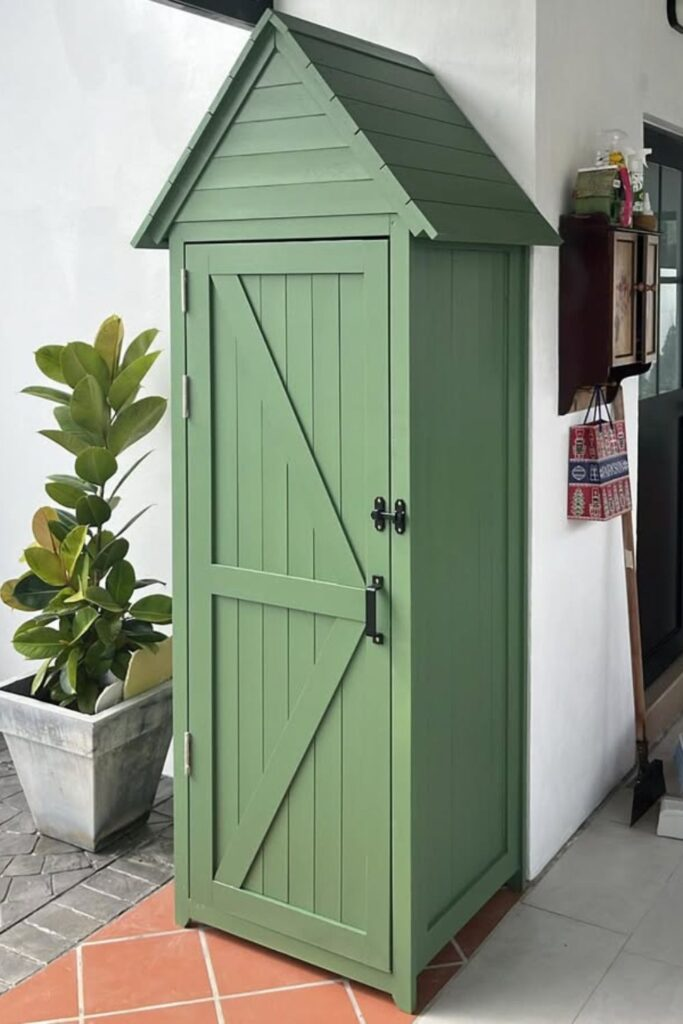 This is a tall, thin cabinet with a pointed roof. Its slim shape is perfect for a balcony, patio, or a small corner. You can store a compact electric mower inside. The wooden panels are sturdy and it has a latch to keep the door closed. It looks attractive and keeps your tools organized and protected.