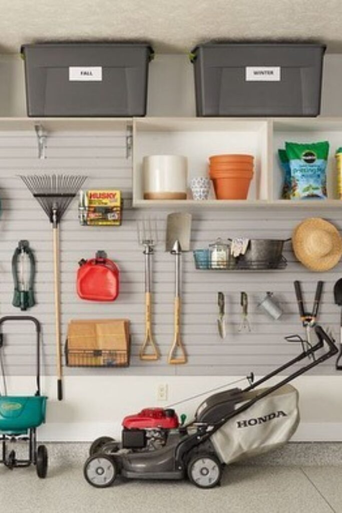 Organize your garage with a wall panel system. You can store your push mower on the floor underneath. Above it, use hooks and clear, labeled bins to hold all your tools and small parts. This slat-wall setup keeps everything visible and within reach, getting rid of clutter on your garage floor.
