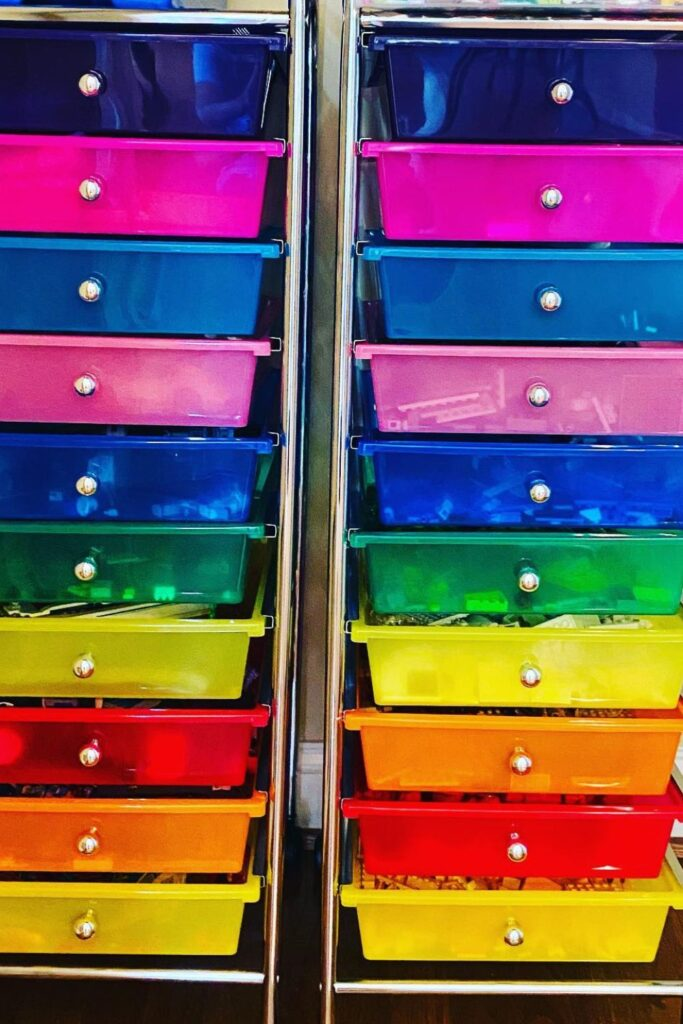 Turn your storage into artwork with a rainbow drawer wall system. The drawers, grouped by color, create a bright and useful display. This setup makes sorting easy and adds a decorative look to your room. Builders of all ages like how practical and nice it looks.