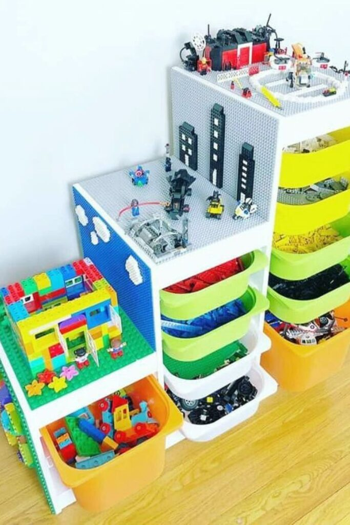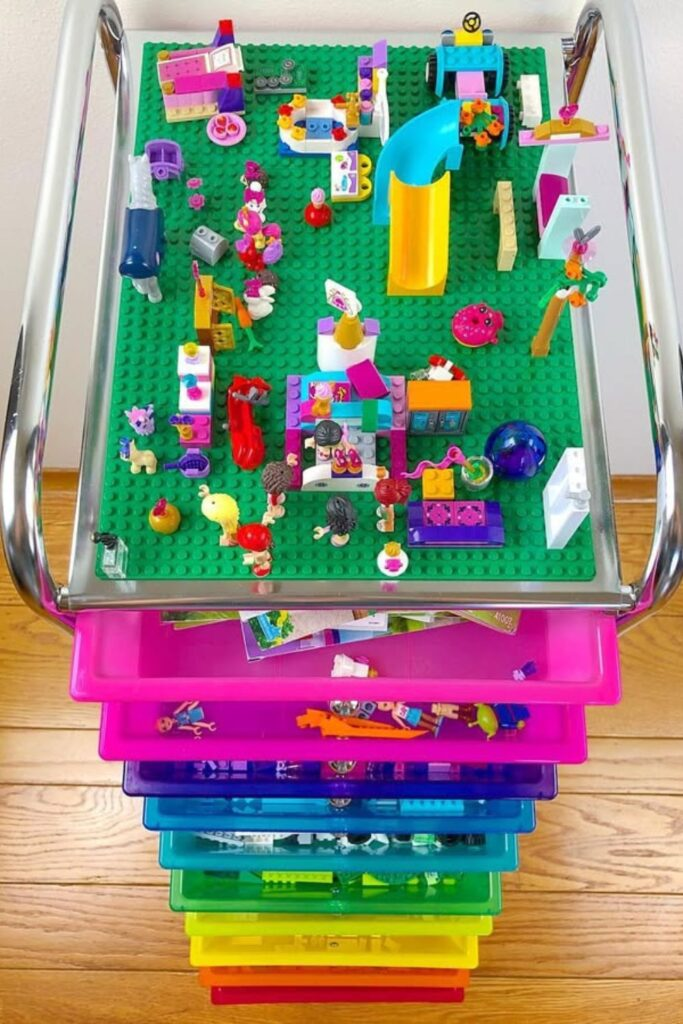 Make Lego play movable with a rolling drawer cart that has a building surface on top. The drawers can be organized by color, theme, or part type. The top works as a place to build. With wheels for easy moving, kids can bring their Lego setup anywhere. This is great for small spaces or creativity on the go.