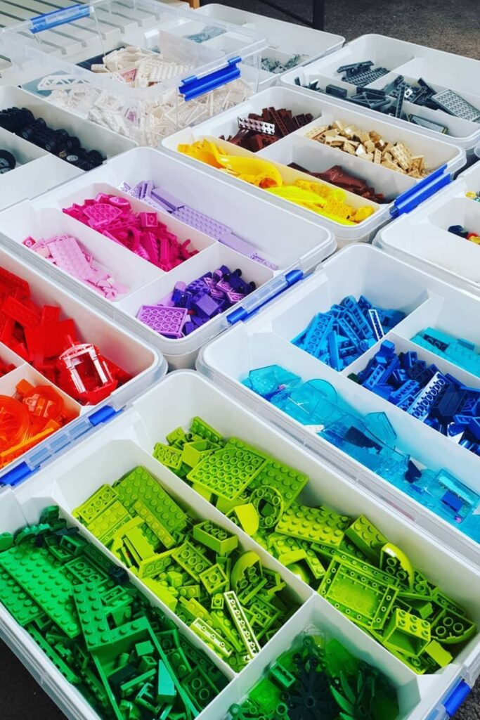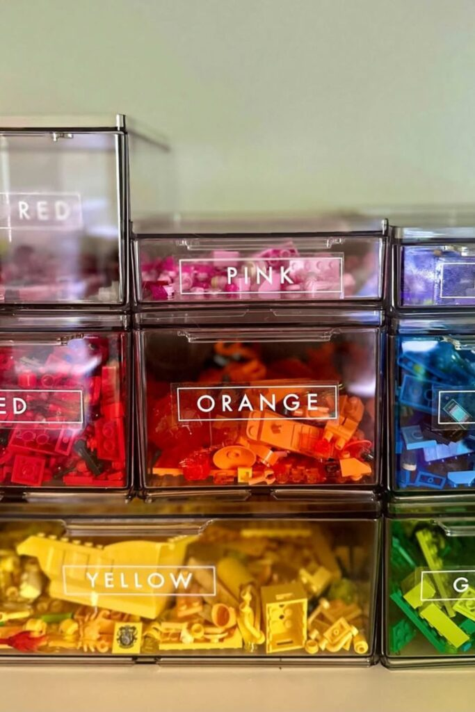 Get perfect Lego organization with clear drawers and color labels. Labels like “dark red” or “light blue” make finding the exact piece very easy. These stackable, matching containers bring both order and a pleasing look to your Lego collection.