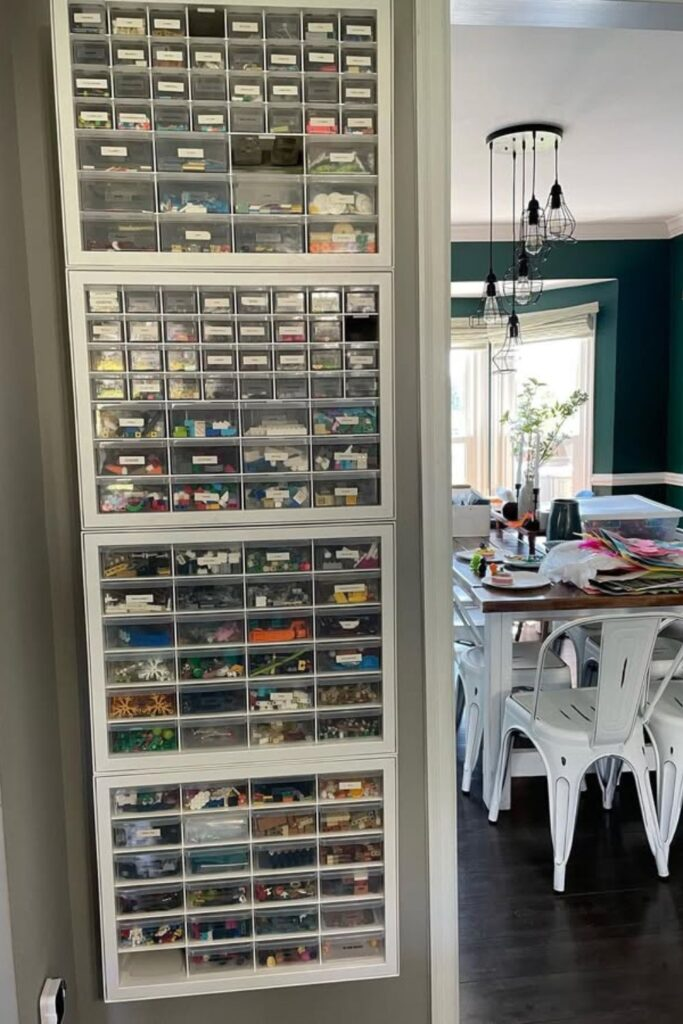 Make the most of your space by using wall-mounted drawer units. They use your vertical wall space for storage. The clear drawers let you see the contents easily, and the many compartments allow for detailed sorting. This system is ideal for serious collectors. It can change a hobby room into an organized Lego space.