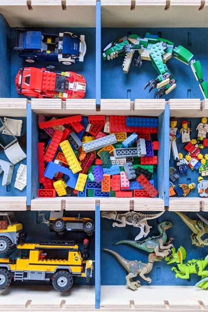 Make sorting your Legos smooth with a divided drawer organizer. Each small section holds a specific color or kind of brick, making it fast to find the piece you need. This system is ideal for serious builders. It makes sure small parts stay organized and ready to use.