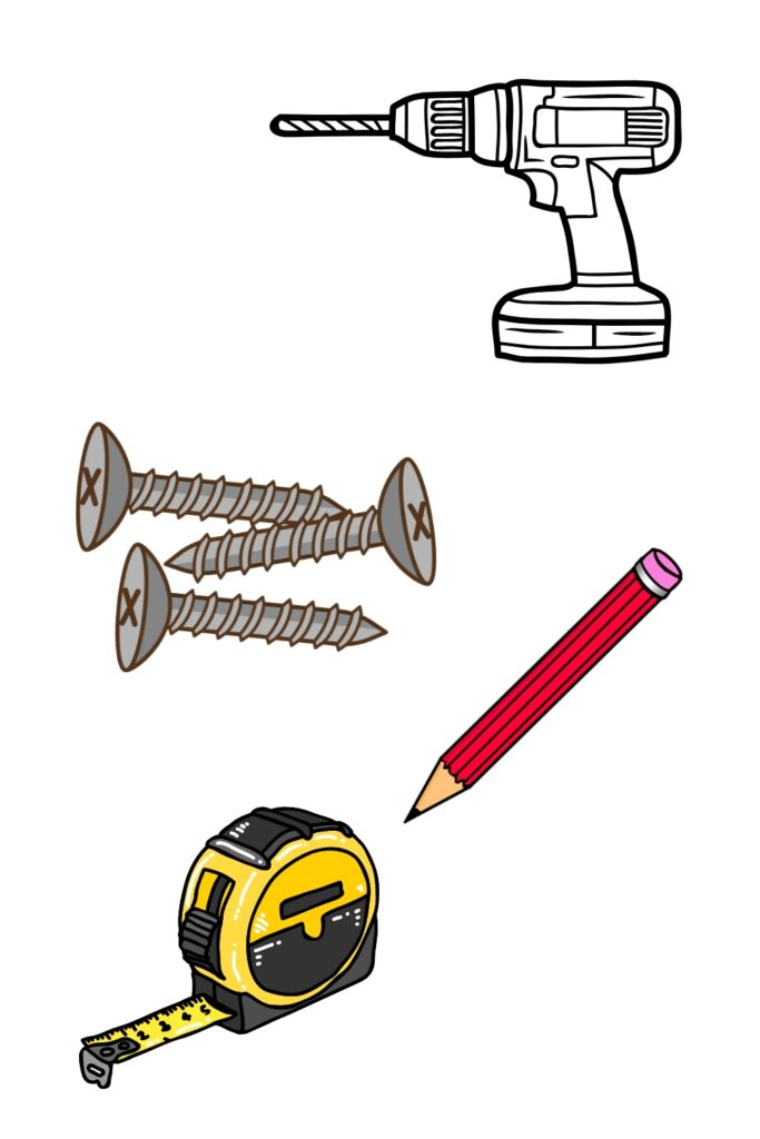 Collect screws, wall anchors, a drill, a screwdriver, a measuring tape, and a pencil so you are fully ready.