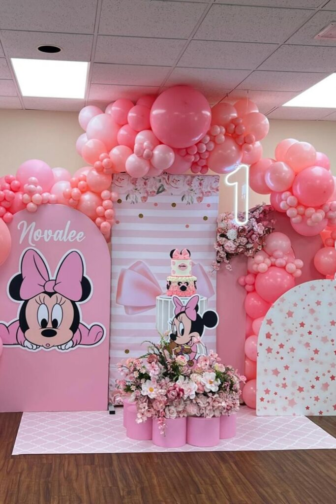 A balloon arch with a Minnie-themed backdrop can instantly turn any room into a party space. Placing it behind the dessert table helps anchor the whole setup.