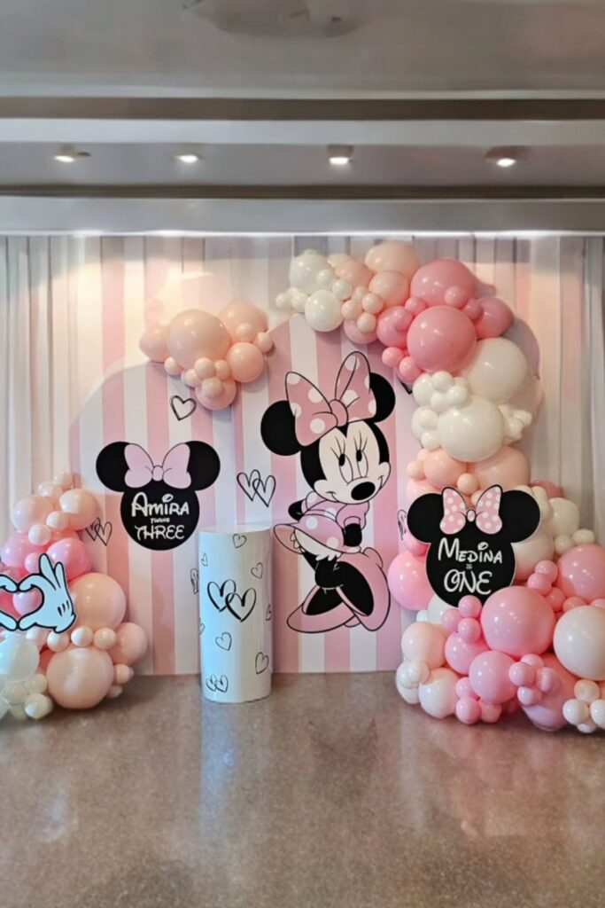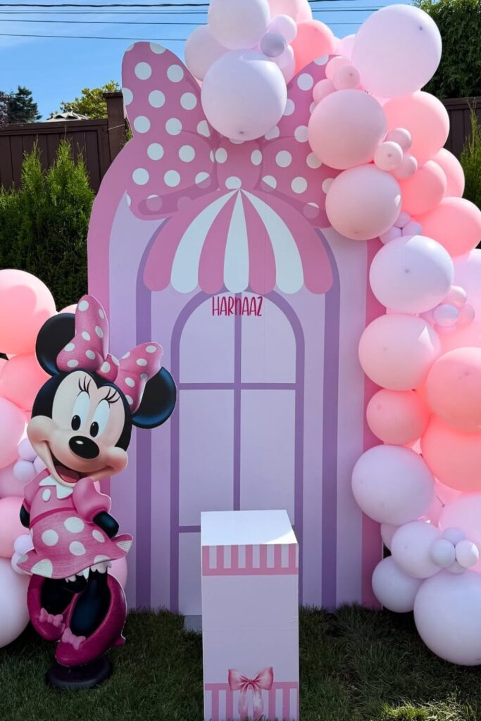 Large pastel balloons add height and make the entrance feel special without being too heavy. A Minnie standee adds a playful touch.