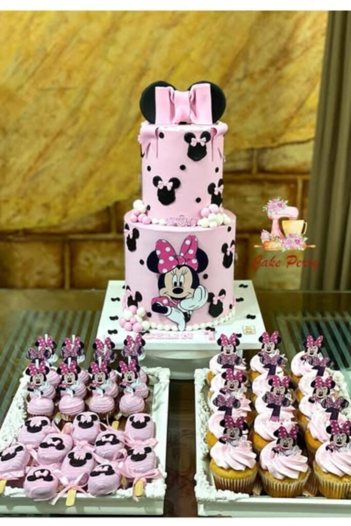 Layered panels and striped backgrounds add depth to a cake corner. A Minnie cutout keeps it playful.