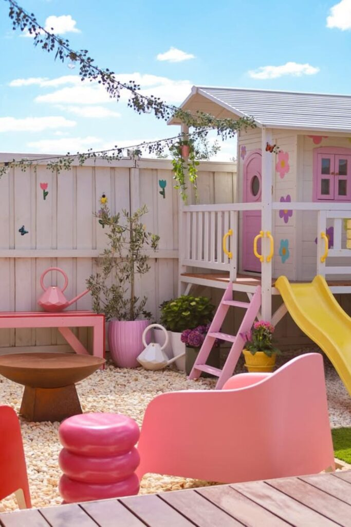 This playhouse turns a backyard into a soft pastel paradise. It features flower decorations, yellow slide handles, and painted shutters to add charm. Gravel and colorful watering cans complete the magical feel. The warm pink, yellow, and lavender colors make it a happy place for kids to play or relax.