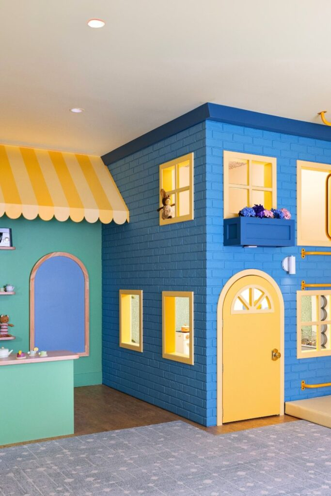 A bright two-story playhouse painted with bold colors like blue, yellow, and green. It has shutters, an awning, and a cozy interior, inspiring kids to imagine running a café or store.