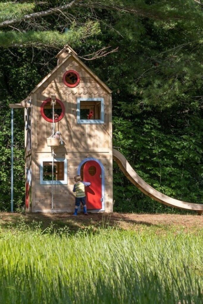 This rustic playhouse has shingle siding, pink window frames, and flower boxes. The walls lean slightly, adding a playful handmade look. It’s perfect for inspiring daydreams and outdoor fun.