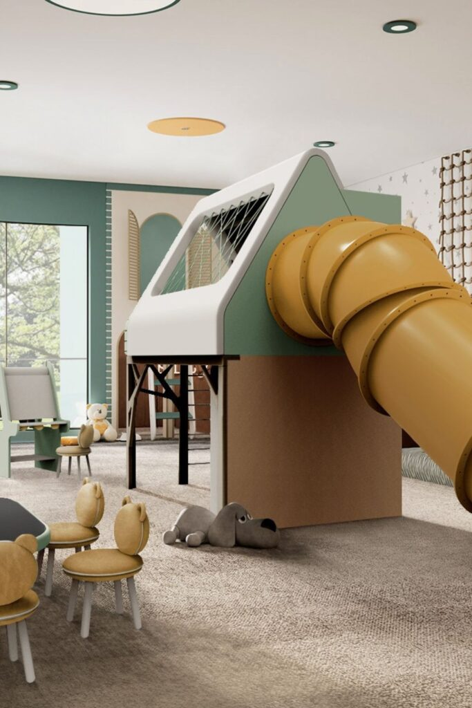 An indoor playhouse with a pallet frame, spiral tube slide, climbing net, and art station. The modern green and mustard colors give it a sleek look, ideal for larger playrooms or activity centers.