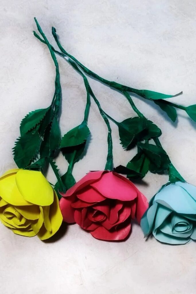 Create a lovely bouquet with paper roses in yellow, red, and blue on green stems.