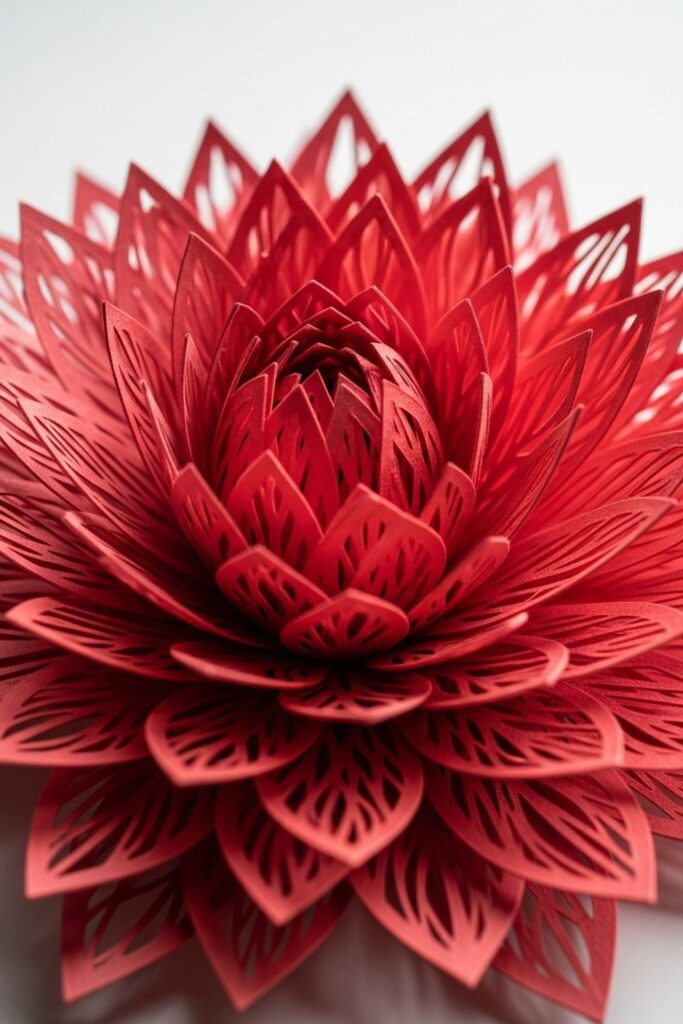 Make a bold artistic statement with a red lotus flower that has intricate, lace-like petals.