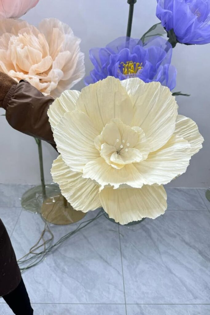 The petals are ruffled and made from a material that looks like crepe paper.