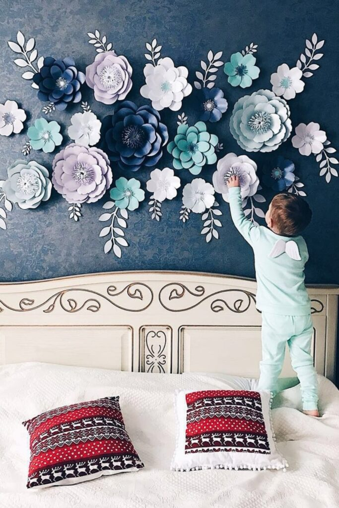 Turn a bedroom wall into a beautiful piece of art with paper flowers in pastel and navy blue.