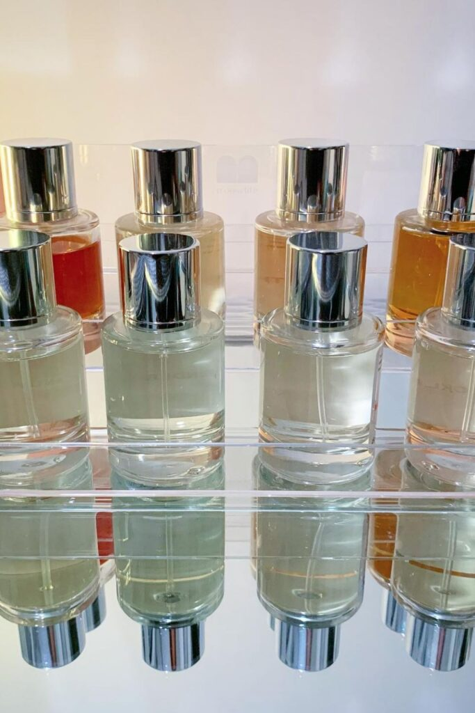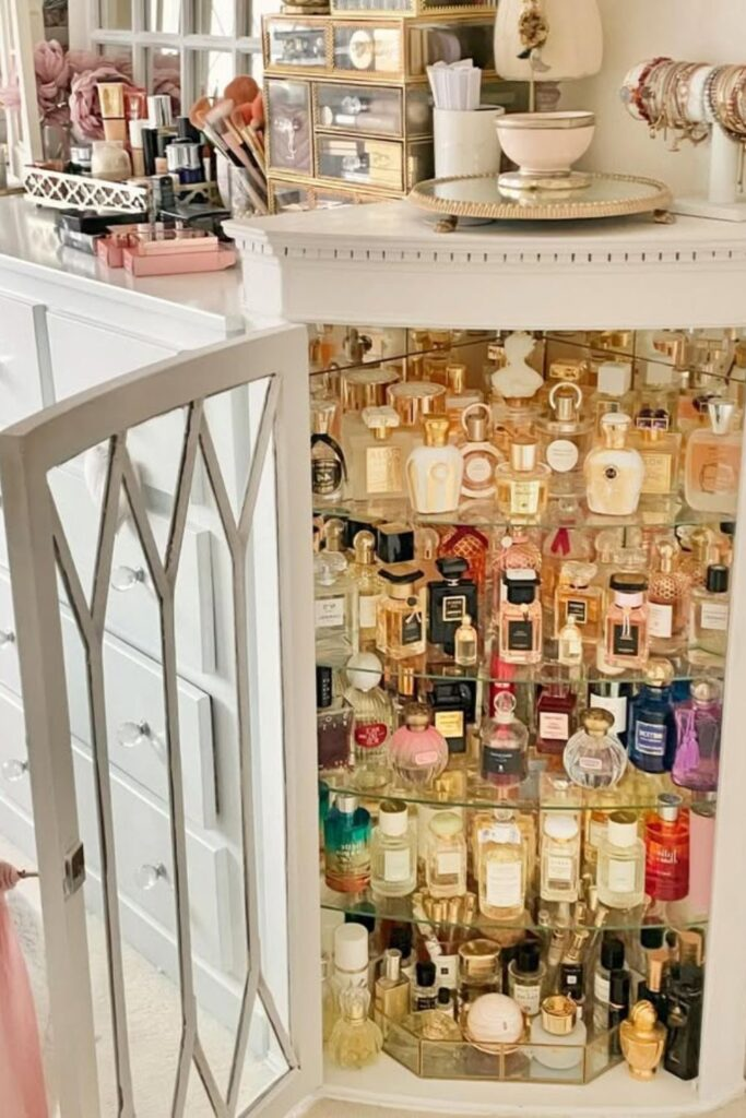 An enclosed mirrored cabinet is a luxurious home for perfumes. The mirror adds light and depth. Glass shelves and a door protect from dust. It turns your collection into a boutique-style showcase.