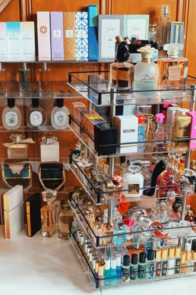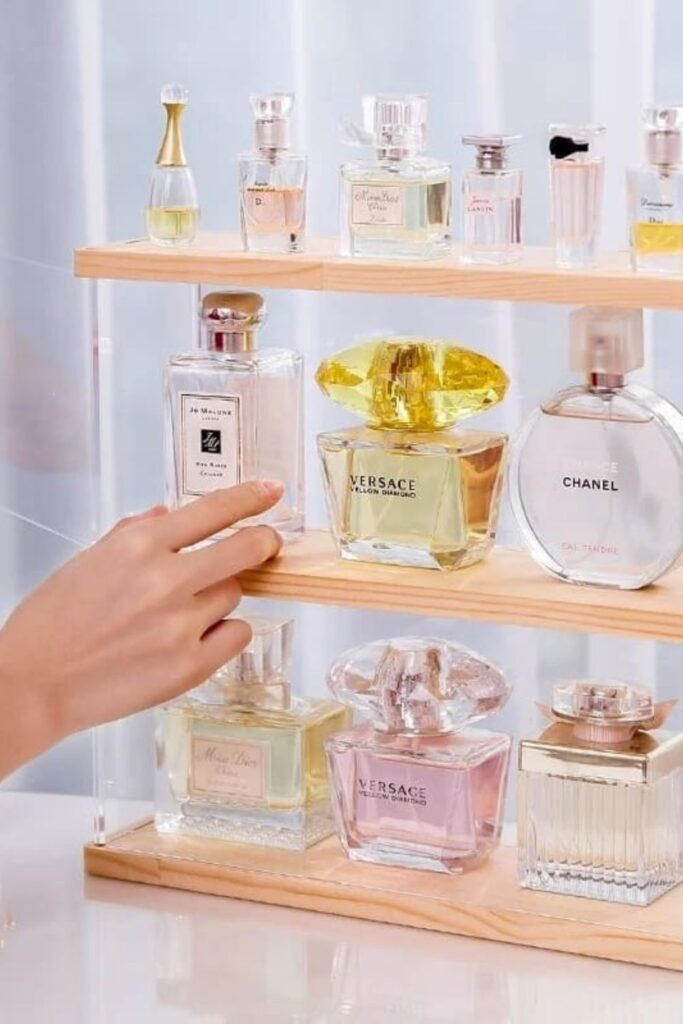 A clear, tiered acrylic rack gives a clean and modern look. The see-through design shows off your bottles. You can organize perfumes by size or color on the different levels. This is perfect for a minimalist style.