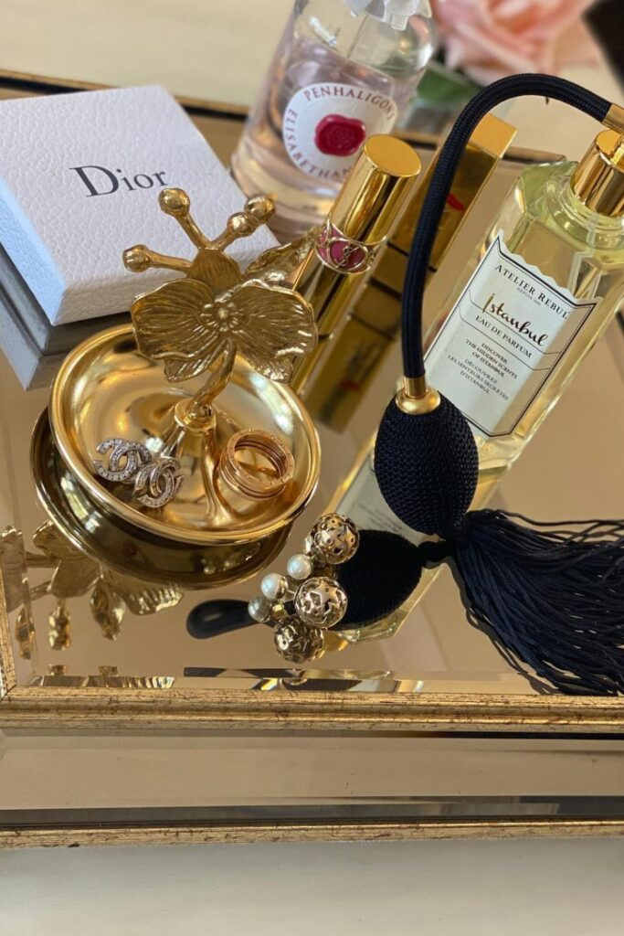 A mirrored perfume tray is both luxurious and functional. The mirror makes the bottles look even better. Raised edges keep everything in place. You can pair perfumes with jewelry for a personal touch on a vanity.