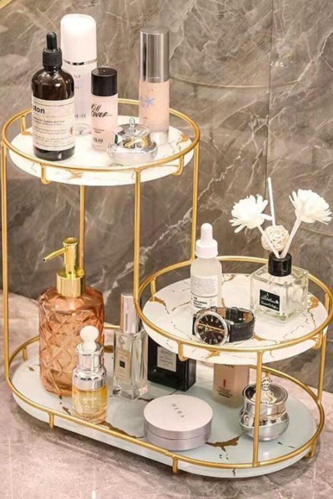 A marble and gold tiered stand adds high-end charm. Its compact design holds perfumes and beauty essentials. The marble base looks sophisticated, and the vertical layout saves space on a counter.