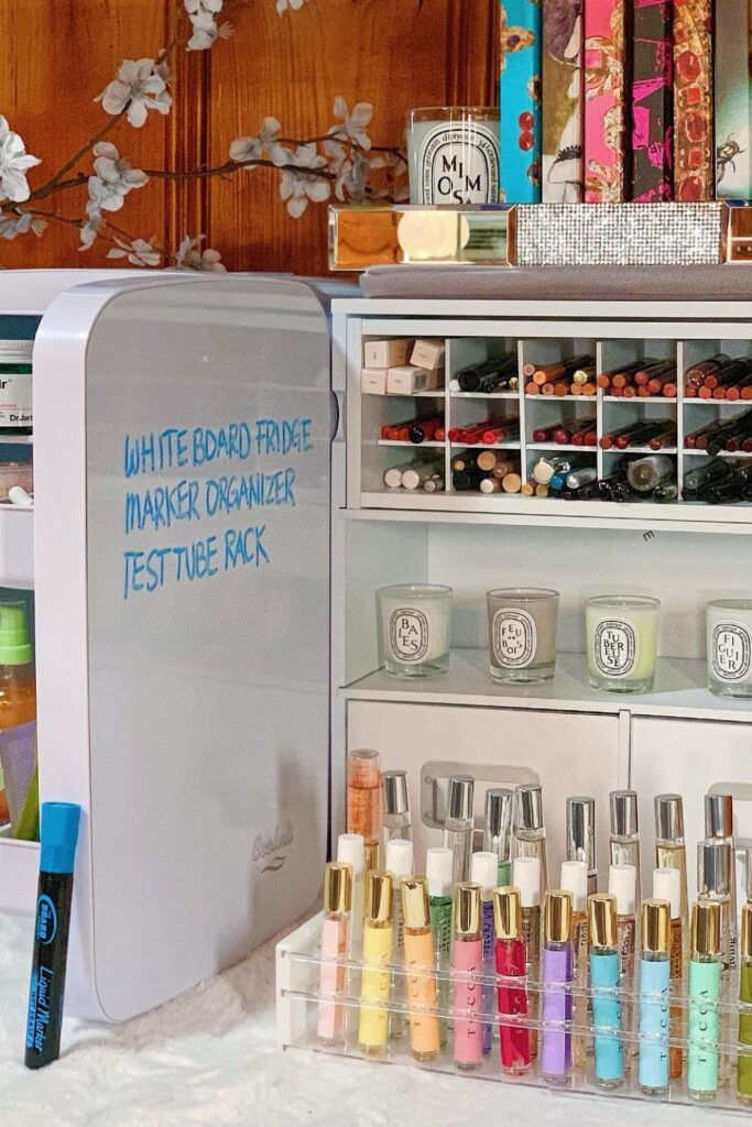 A test tube-style acrylic rack holds travel sprays or slim bottles upright. This creates a sleek and modern display. Arrange colorful bottles for an artistic look or keep it uniform for minimalism.