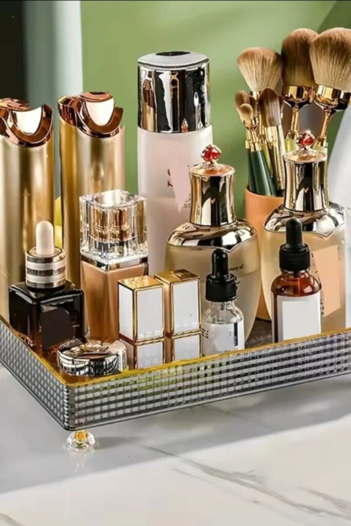 A rotating acrylic organizer gives you easy access. You can spin it to find any bottle quickly. The multi-tiered sections hold perfumes and other beauty items. This is a space-saving solution for larger collections.
