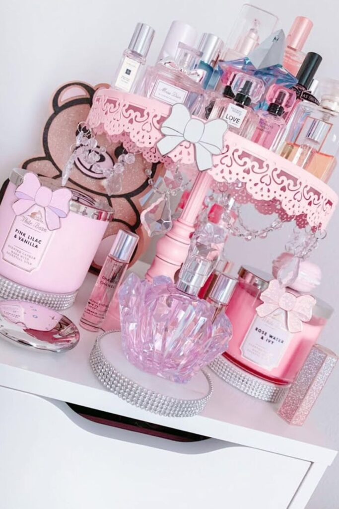 A pink decorative tiered stand adds playfulness. With hanging crystals and bows, it’s both storage and a statement piece. It’s a fun and youthful choice for showing off colorful bottles.