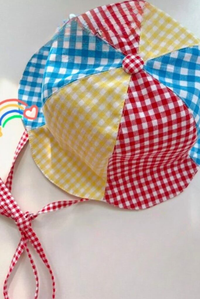 You can make a fun and colorful bucket hat by sewing fabric pieces together. Cut several same-sized wedges from different gingham fabrics. Sew these wedges together to form the crown of the hat.