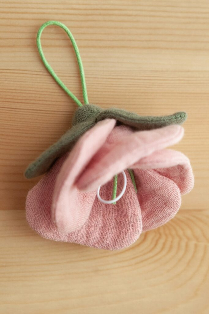 A fabric flower charm is a small and pretty decoration for bags or keys. Cut petal shapes from soft cotton or linen material. Sew along the edges and pull the thread to gather the petals into a flower.