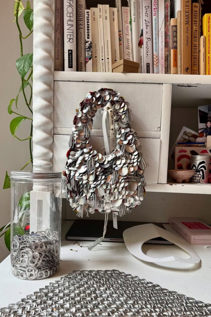 Sew or crochet the panels together to create the bag shape. Adding a fabric lining inside makes the bag stronger and more useful. The shiny layers give it a special and eco-friendly style.