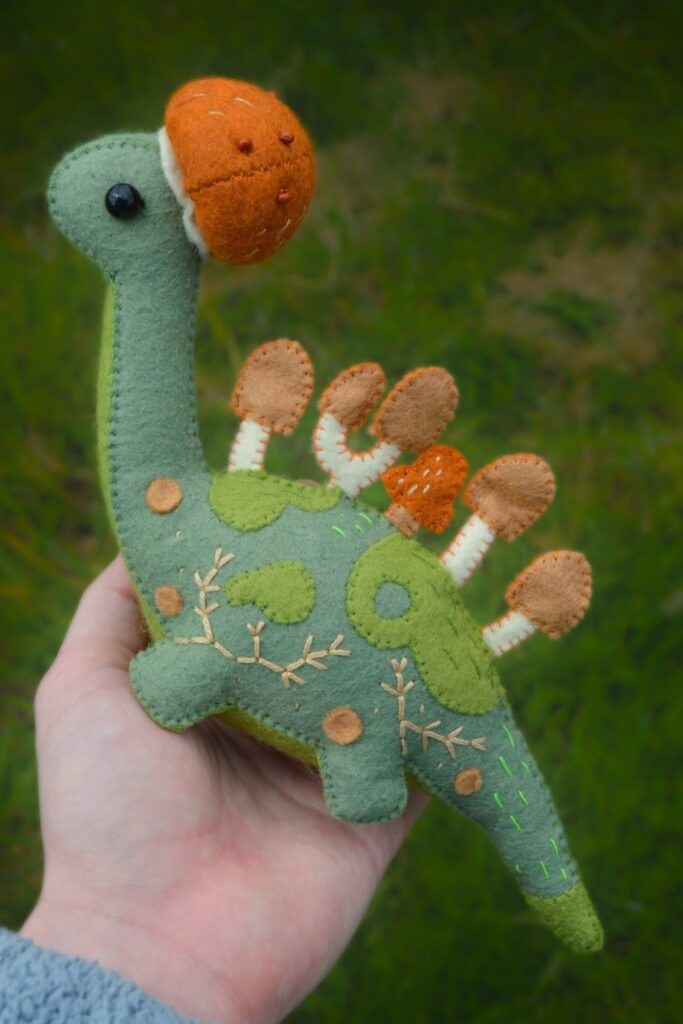 You can add wonderful details with embroidery. Stitch on vines, spots, and even tiny mushrooms on its back. These small touches give your dinosaur a lot of personality.