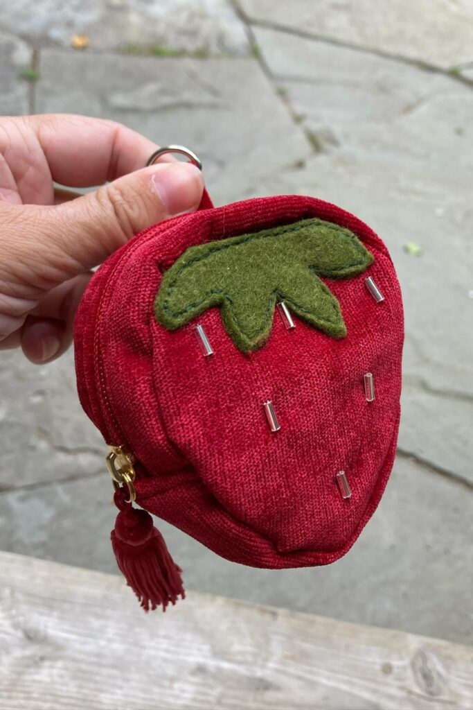 This strawberry coin purse is a cute way to practice small sewing. Cut red fabric into a strawberry shape and sew it into a small pouch. You will need to install a small zipper at the top.