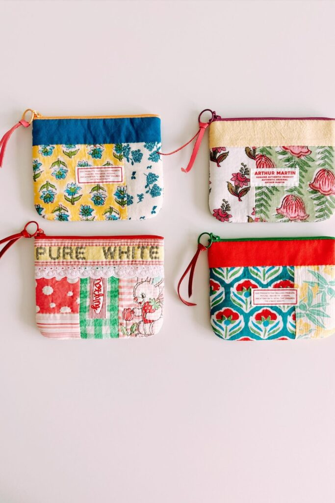 These pouches are perfect for using up leftover fabric scraps. Sew small pieces of fabric together to create a patchwork panel. This patchwork piece becomes the outside of your pouch.