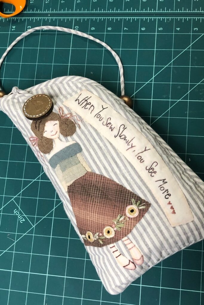 You can add details with embroidery stitches. Stitch a fabric strip with a handwritten or embroidered quote to the front. This makes the pouch special and unique to you.