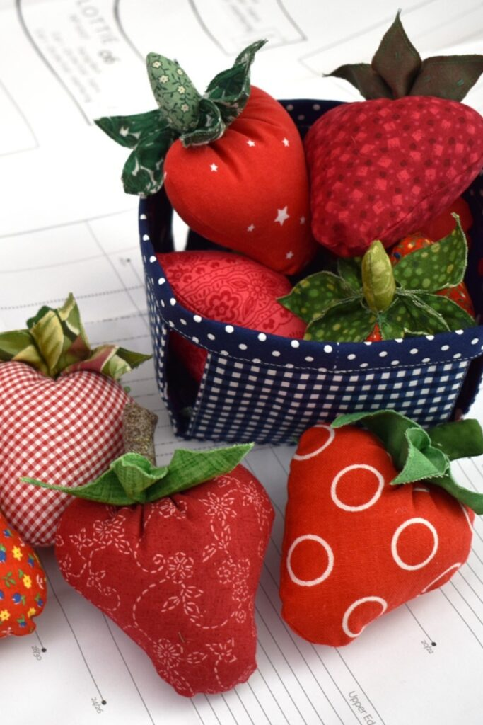 These little strawberry plushies are perfect for using fabric scraps. Cut red fabric into heart shapes. Sew two hearts together, leaving the top open, and then stuff them.