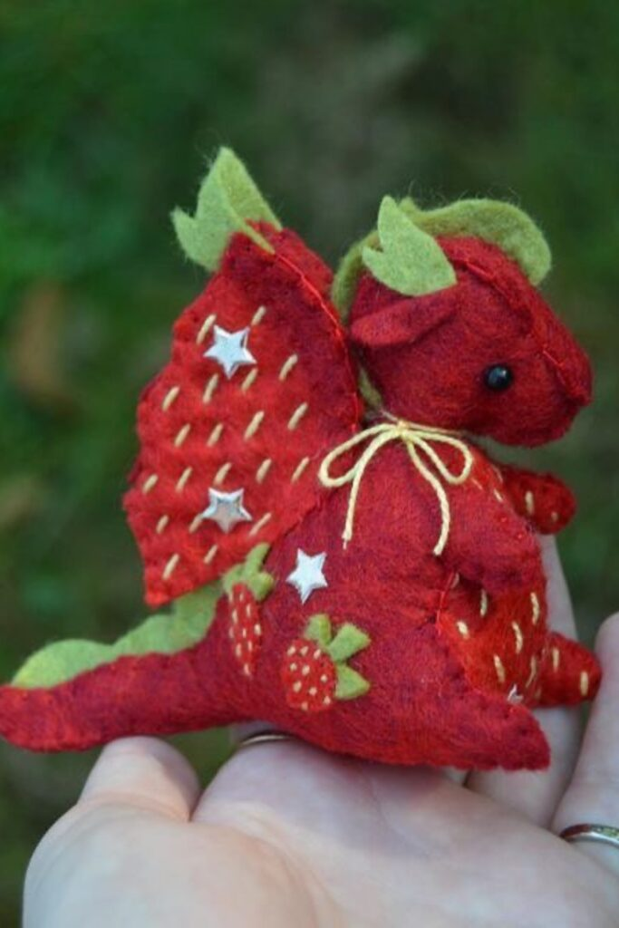 This strawberry dragon is a magical and fun sewing project. Cut the dragon’s body from red felt to look like a strawberry. Use green felt for the leaves, horns, and wings.