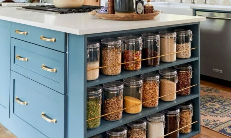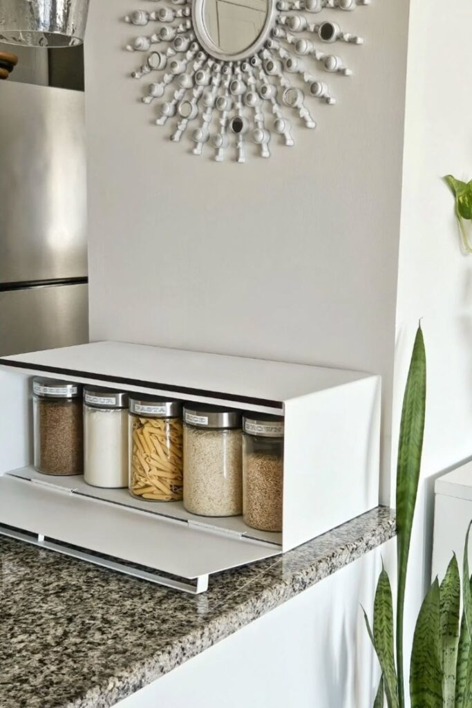 Make your counter neat with a sleek pull-down storage unit that hides five labeled canisters. Made for grains, pasta, or baking supplies, this simple system keeps basics close by while making sure your counter is tidy and free of clutter. With vertical lids and a thin shape, it is the perfect solution for small kitchens that want practicality with style.