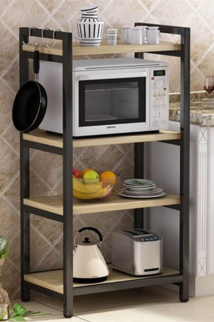 Organize your appliances with a thin, open-frame shelving rack. It has several levels, so it can hold a microwave, kettle, toaster, and dishes all in one tall unit. The mix of metal and wood adds an industrial look. Hooks on the side can hold small pans or utensils. This space-saving station is perfect for keeping your daily items together while giving you more free counter space.