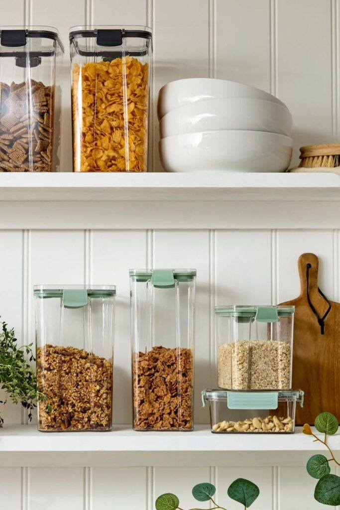 Make breakfast simple with a clean wall shelf holding airtight cereal containers and stacked bowls. The clear jars let you see how much is left. Labels on the lids keep everything organized. Below, smaller jars can store grains and nuts for a neat look. This simple but useful setup uses matching containers and a neutral color scheme for a very tidy feeling.