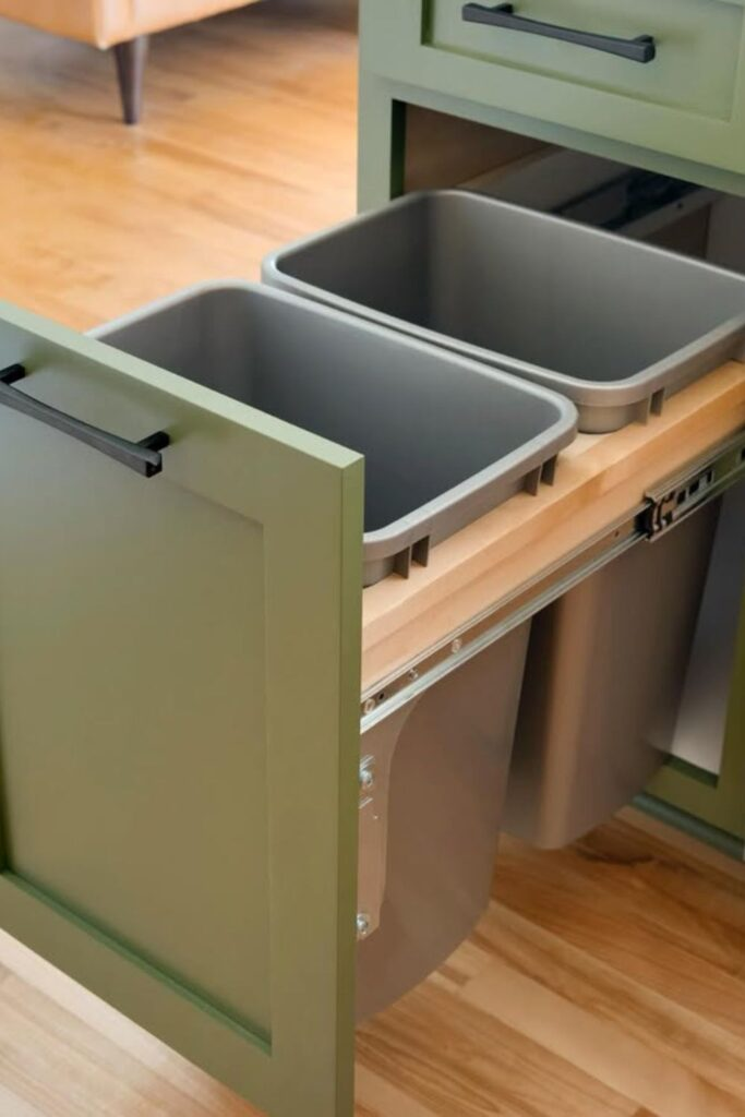 Keep your garbage out of sight with a two-bin pullout drawer hidden inside a smooth cabinet. This setup fits right into your kitchen’s look. It has a soft-close feature to make it quiet and keep things neat. It separates trash and recycling, reduces smells, and saves floor space. This setup makes cleaning up easy while keeping a clean, uncluttered look, especially in small kitchens.
