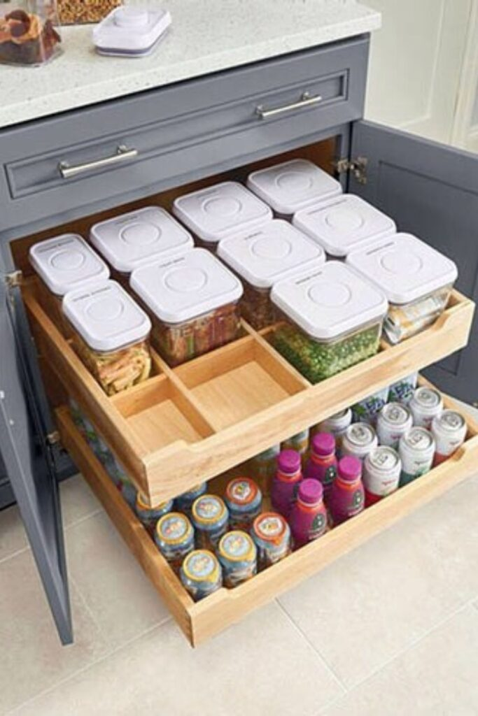 Get the most from a deep cabinet with a double pull-out drawer system. The top drawer organizes airtight pantry containers and snacks using labeled bins. The bottom level stores cans and jars. Everything stays visible and in order, so you never have to dig around. The cabinet’s custom wooden finish adds warmth and style to this very practical setup.