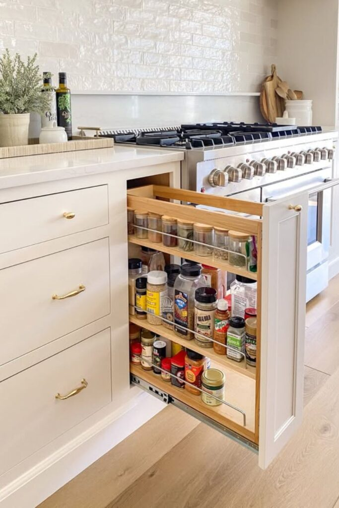 Add function to tight spots with a thin, pull-out spice cabinet next to the stove. Tiered shelves hold spices, sauces, and jars in an easy-to-see setup. The full-extension feature lets you grab ingredients quickly while cooking. The compact design keeps your kitchen neat and organized. This is ideal for making a small or busy cooking area more efficient.