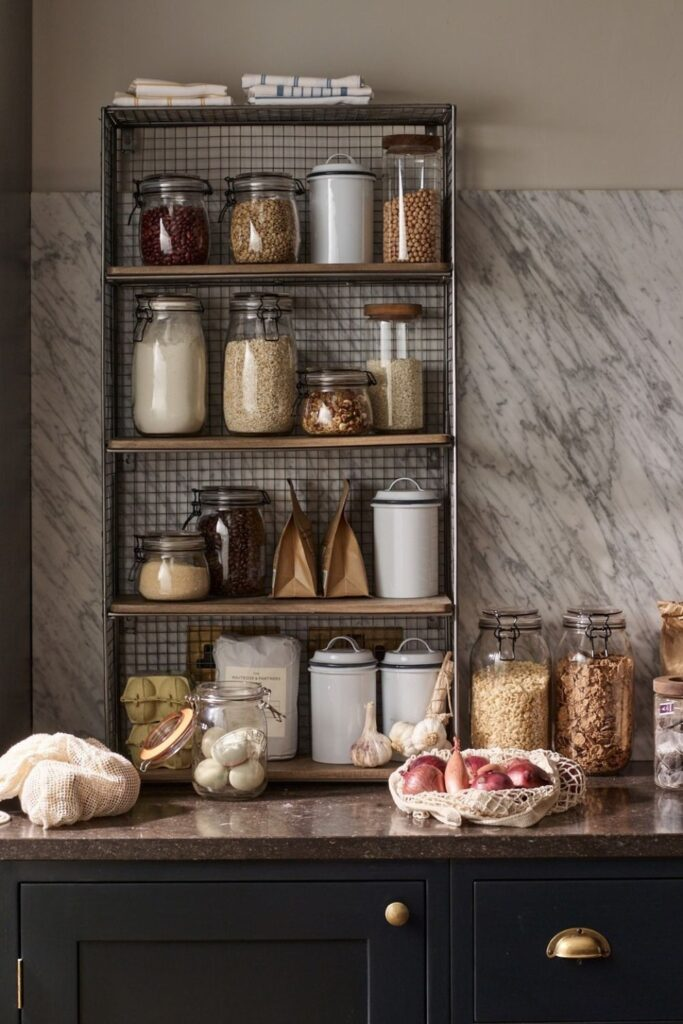 Make a freestanding pantry with a tall wire-backed shelving rack. It is perfect for lining up glass jars, canisters, and bags. The open-shelf design makes it easy to see everything, from dried beans to baking basics. The industrial-style frame with wooden shelves adds a bit of stylish function. This tall solution is great for renters or anyone who needs visible, organized storage without a built-in pantry.