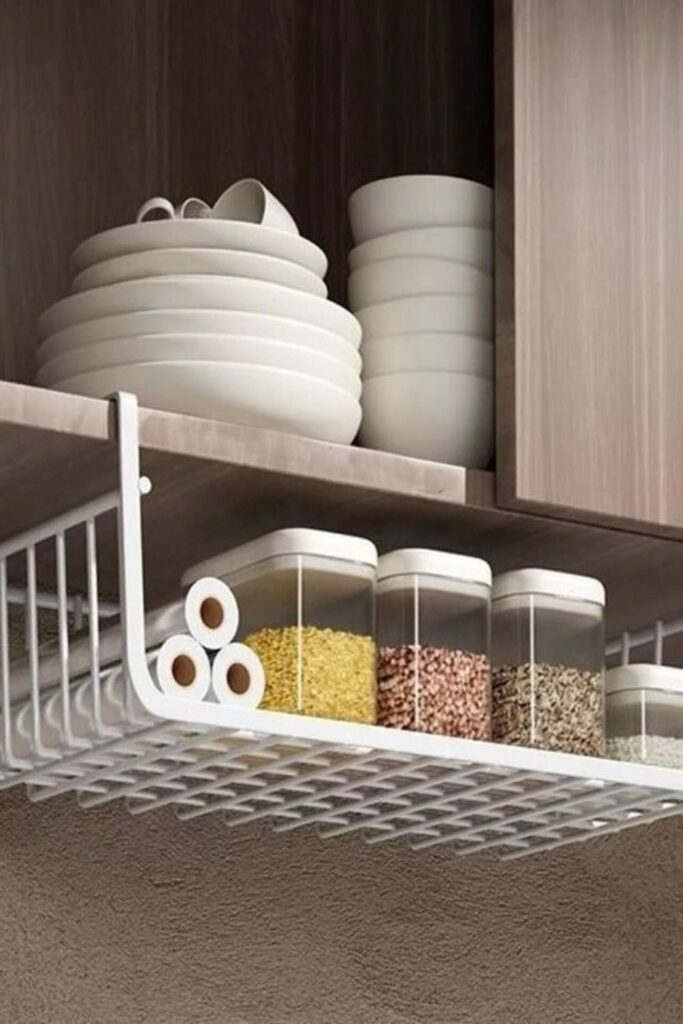 Use space that is often wasted with an under-shelf basket. Hanging under your cabinets, it doubles your vertical storage for grains, small jars, or wraps. The thin metal design fits any kitchen style. It gives you a simple solution to maximize space. Whether you are renting or fixing up your own kitchen, this easy storage trick boosts efficiency without needing installation.