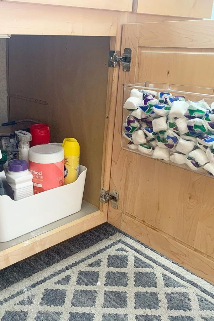 Maximize cabinet space with a clear container mounted on the inside of a cabinet door. Use it for small items like dishwasher pods. Mounted on the door, it keeps essentials visible and easy to grab while freeing up shelf space for larger cleaners stored in a bigger bin. This clever setup makes the most of unused door space. It is especially handy in lower cabinets to keep things organized and functional.