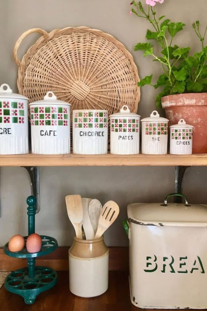 Add charm and order with old-fashioned ceramic canisters on a wooden shelf. They are perfectly labeled for sugar, coffee, and pasta, bringing a nostalgic feeling to your kitchen. Below, utensils and a bread box are grouped neatly, creating a coordinated space. This setup not only keeps essentials easy to get but also adds a cozy, vintage touch as part of your decor.