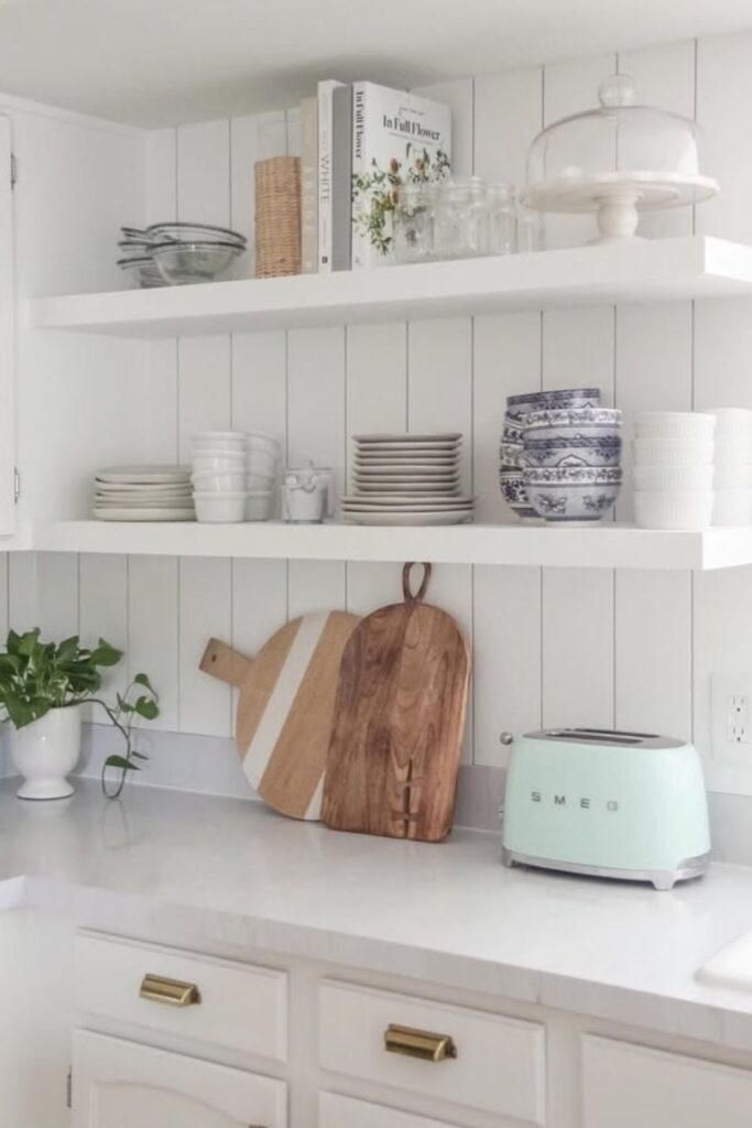Brighten your kitchen with floating white shelves for dishes, bowls, and serving pieces. Adding a few books or decorations keeps it interesting to look at. Matching colors create an airy and organized look. Without upper cabinets, this design maximizes vertical space. It gives small kitchens a clean, open feeling without losing function.